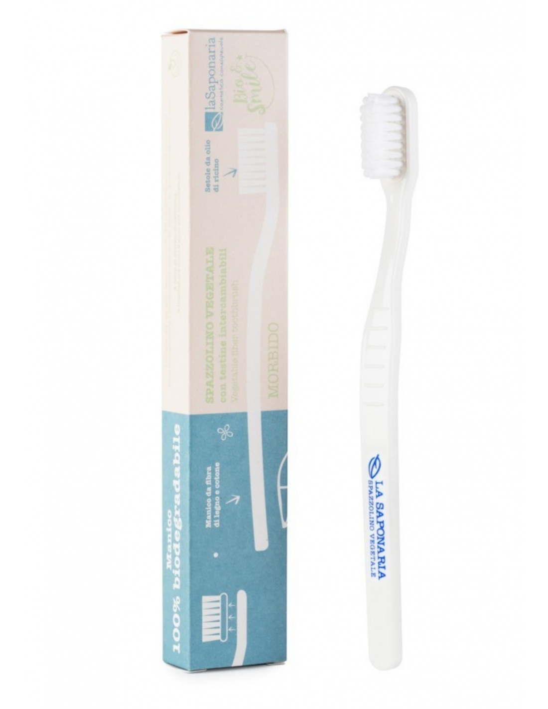 Il manico è in acetato di cellulosa, una sostanza ricavata dalla polpa del legno e dal fiocco di cotone. La testina intercambiabile, invece, è dotata di setole in olio di ricino, materiale ottimo per una delicata ma efficace igiene quotidiana di denti e gengive.